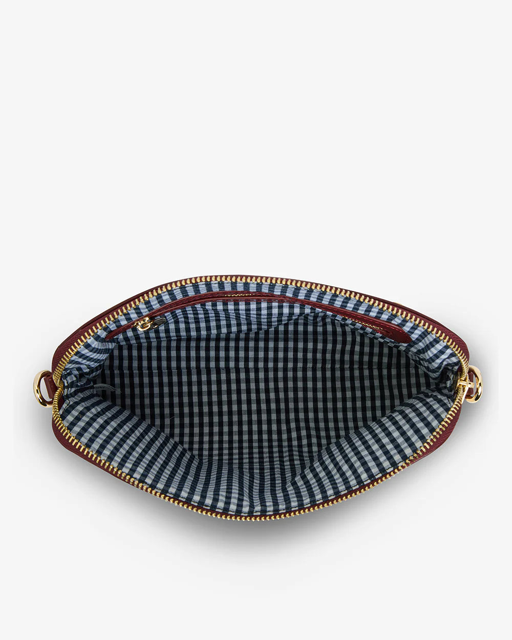 The Elms+King Burbank Crossbody Large offers the functionality and hands-free ease of the compact best-selling Burbank, just with added capacity. Made from premium 100% recycled polyurethane with 14-karat light gold-plated hardware, the Burbank Crossbody Large offers a secure top zipper, our signature blue & white gingham lining and ample depth for all your essentials. The bag comes with two strap options, one wide cotton webbing strap in our exclusive custom stripe, adjustable to 140cm and a second narrow PU strap, also adjustable to 140cm.
