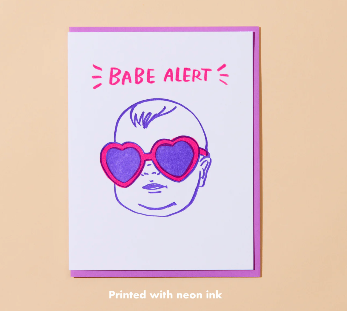 - Card features a baby in heart sunglasses and reads, "Babe alert"
