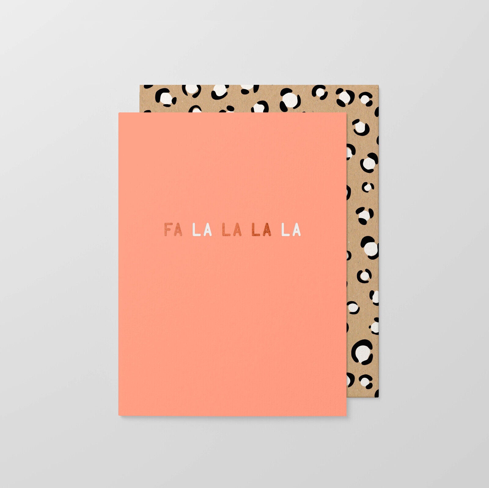 Say no to Christmas clichés with our Fa la la la greeting card and leopard print outer. Finishes: Foil and neon ink. Stock: 350gsm uncoated recycled paper. Inside: Blank. Envelope: Brown kraft recycled paper with black and white leopard print.