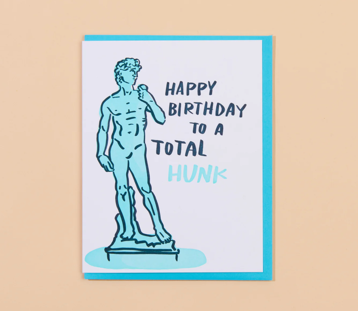 Card reads, "Happy birthday to a total hunk" with an illustration of Michelangelo's David.