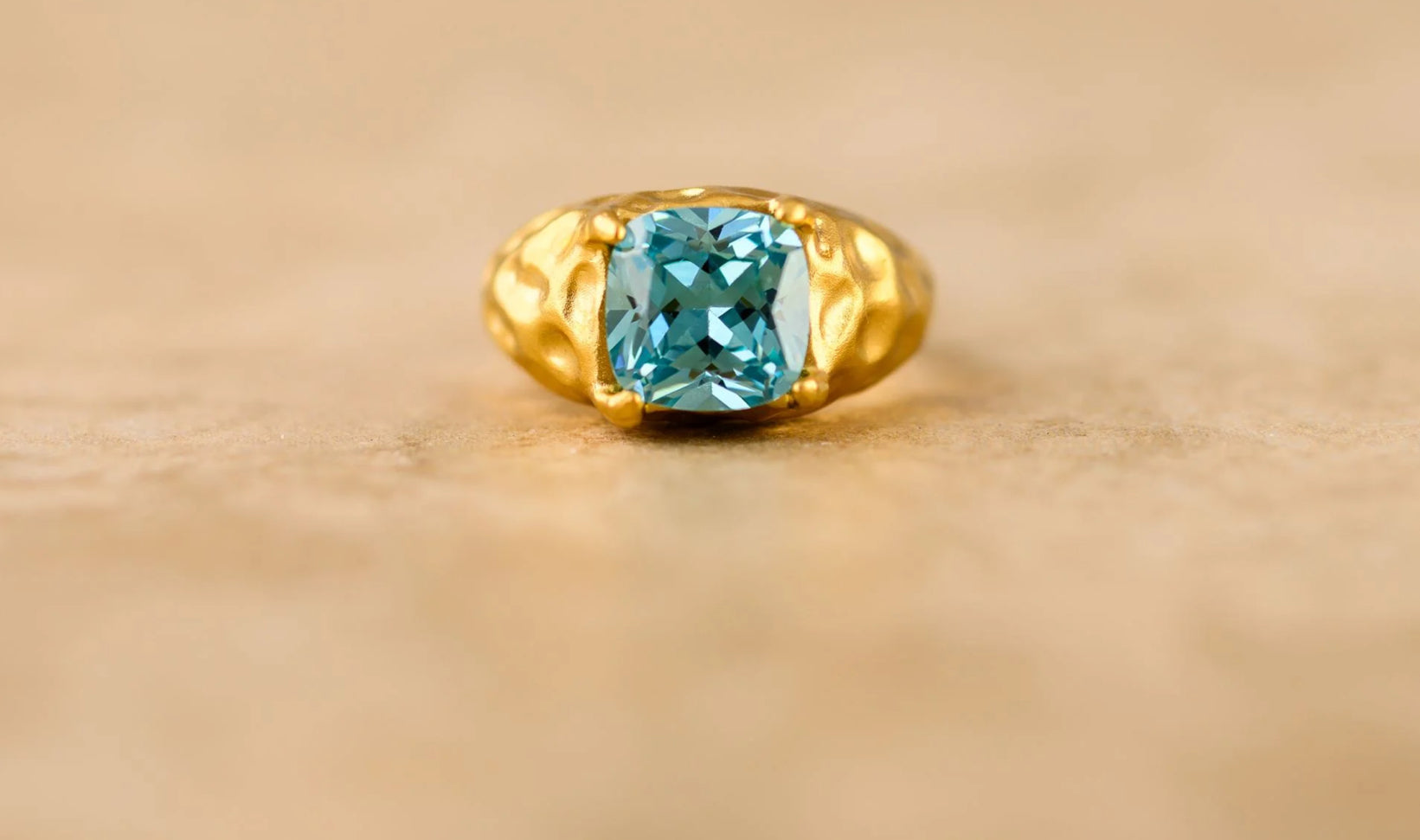 Bold, luminous, and deeply evocative — the MARINE Ring is a statement of strength and serenity. Featuring a striking aquamarine centre stone set in a richly textured 18kt gold vermeil band, this sculptural piece captures the essence of the ocean’s power and calm in one timeless design.